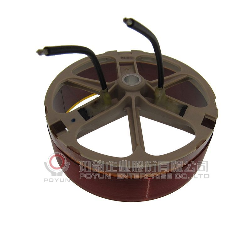 扁綫音圈粘合支架,一层立绕,引綫用铜片引出后再接加黑色绝缘套管的锦丝綫。 BOBBIN: Polyimide 綫材:1-ESVR铜扁綫 补强纸:Polyimide